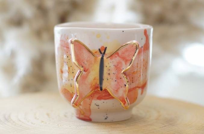 MaterialStoneware clay, underglaze colours, transparet glaze, 22ct gold