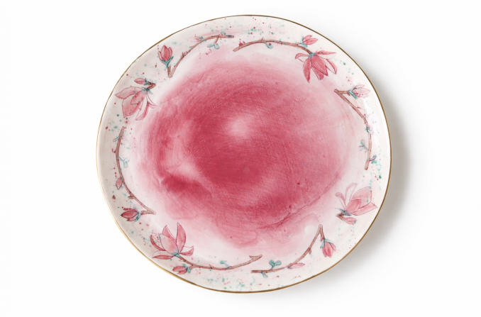 Tanjur za serviranje Magnolija, priča o umjetnosti i eleganciji. Ručno izrađen od bijele gline s cvjetovima magnolije, gdje je svaka latica pažljivo gravirana rukom kako bi uhvatila njihovu prirodnu ljepotu. Nježne ružičaste boje u kombinaciji sa zlatnim rubom donose dašak bezvremenske ljepote u svaku priliku.